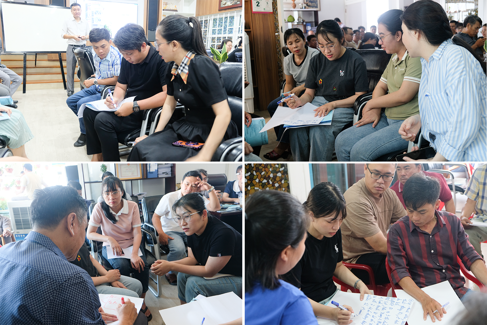 Khóa học diễn ra trong không khí tương tác và thảo luận sôi nổi. Học viên được chia thành 4 nhóm để thực hành và trình bày những chủ đề thực tế do giảng viên đưa ra. Hoạt động nhóm không chỉ giúp củng cố kiến thức, mà còn tăng cường sự kết nối và phối hợp giữa các bộ phận trong công ty.