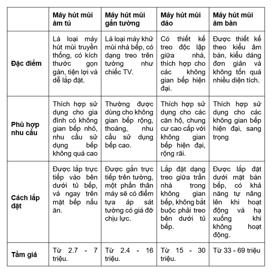 Bảng so sánh các loại máy hút mùi: